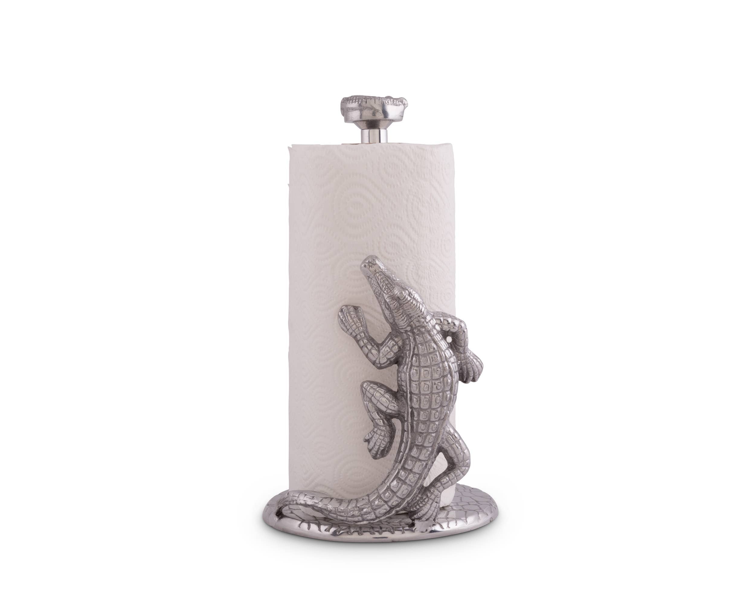 Let this kitchen necessity crawl out of the shadows with Arthur Court's Alligator Paper Towel Holder. This unique design features a crafty alligator working its way up the side of the paper towels, the lifelike detail within its legs and tail creating a realistic, walking posture. Handcrafted in sand-cast aluminum. Size: Diameter: 7.0" / H: 12.5" Care: Dust with damp cloth. Will not tarnish